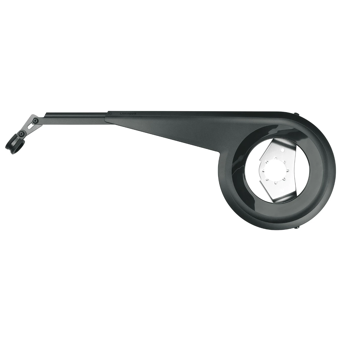 Not without my chainguard! The adjustable profile oft he robust SKS Chainbow chainguard covers the full-length of the chain. Not just to keep your trousers clean and to keep them from getting caught in the gears, but also as effective protection against injuries. The extendable aluminium rail inside the chain case is top cover and rear mount in one. Thus, the chainguard accommodates different frame shapes and sizes, with hub or derailleur gears.