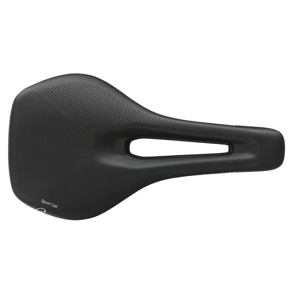 The SR Sport Gel road bike saddle offers 100% suitability for races and yet also maximum comfort. To this end, the flat structure of the road saddle was adapted to the female anatomy in a sporty, active seating position. Gel pads in the seating area distribute pressure, while a large relief channel minimises discomforts in the genital zone. The pressure in the pubic bone area is absorbed by the inlay padding as well as the wide saddle nose and deflected to the sit bones. The rear of the saddle is slightly raised to support pressure distribution, particularly in a strongly forward bent posture.