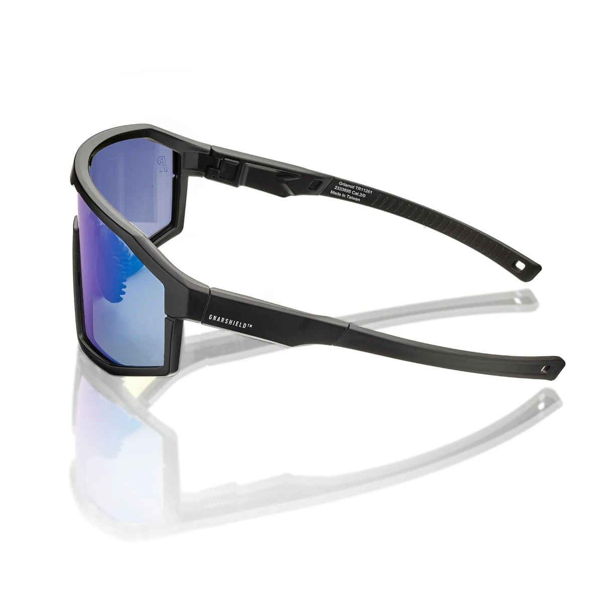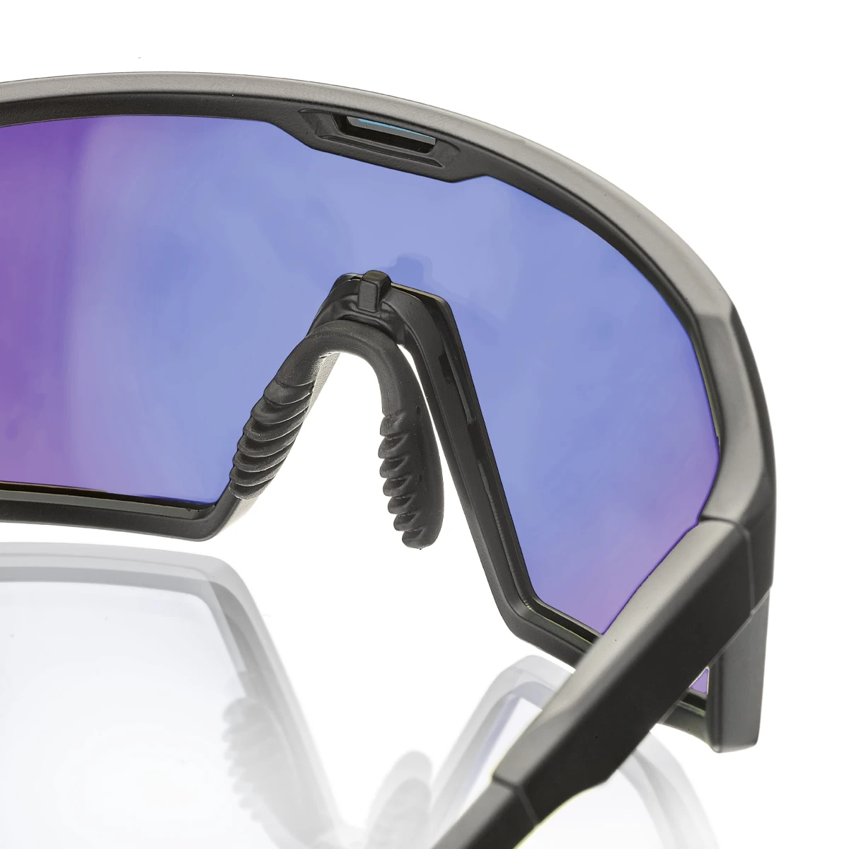 The Full Frame Cycling Glasses by ROSE offer you optimum protection on your tours. The adjustable nose bridge creates a high level of comfort. The full frame is made from partially recycled material and makes the perfect companion for long days on the bike. You have got the choice between two different lenses. The black lens with class 3 UV protection offers you superior protection on sunny days, while the Aurora lens with class 2 UV protection ensures a good vision even on cloudy days. A interchangeable lens is included.