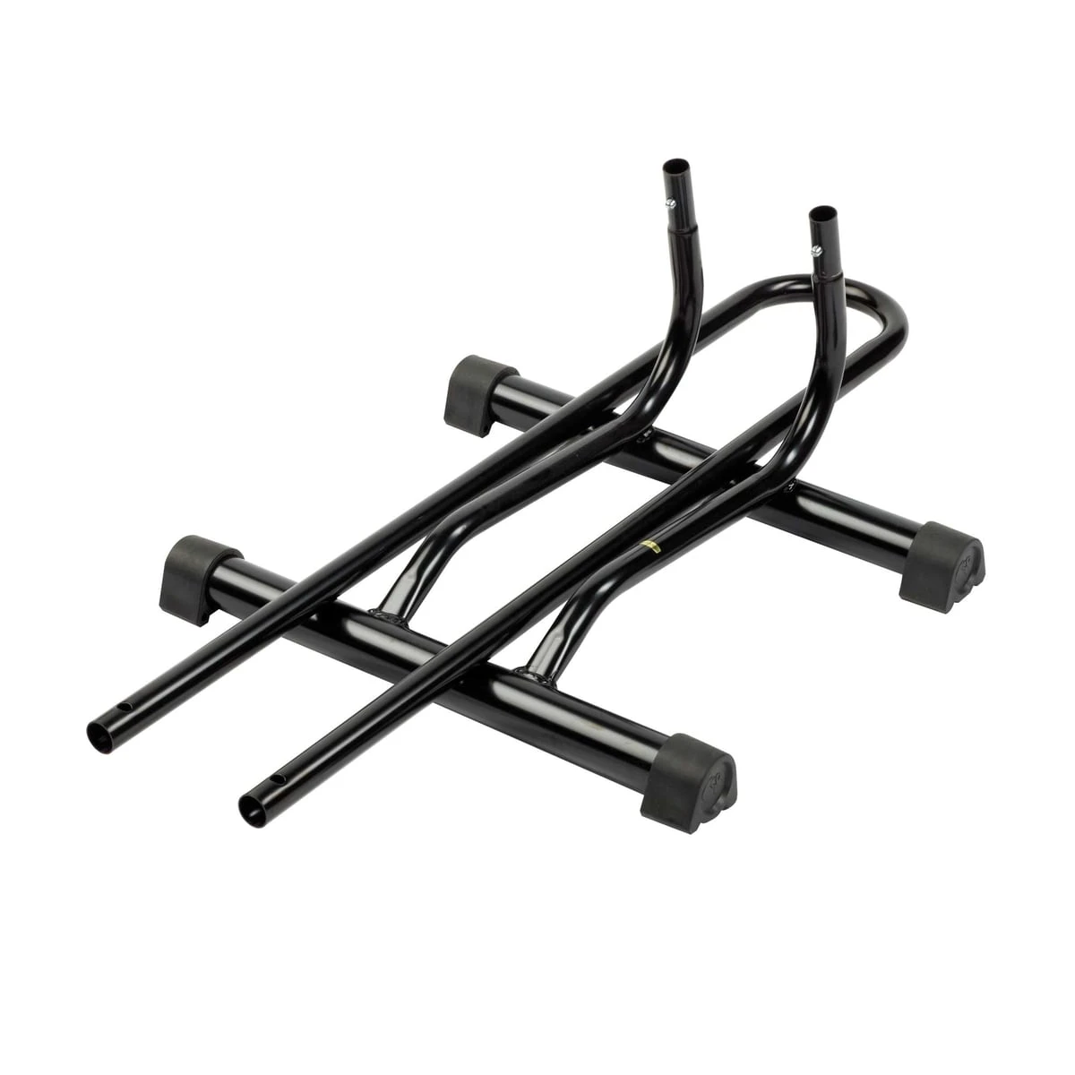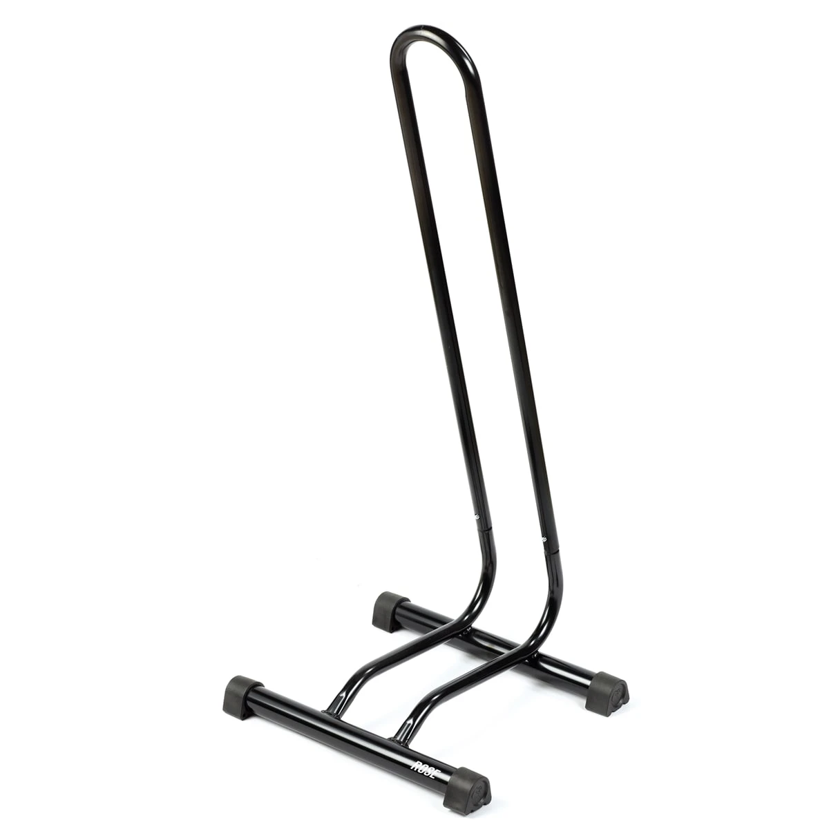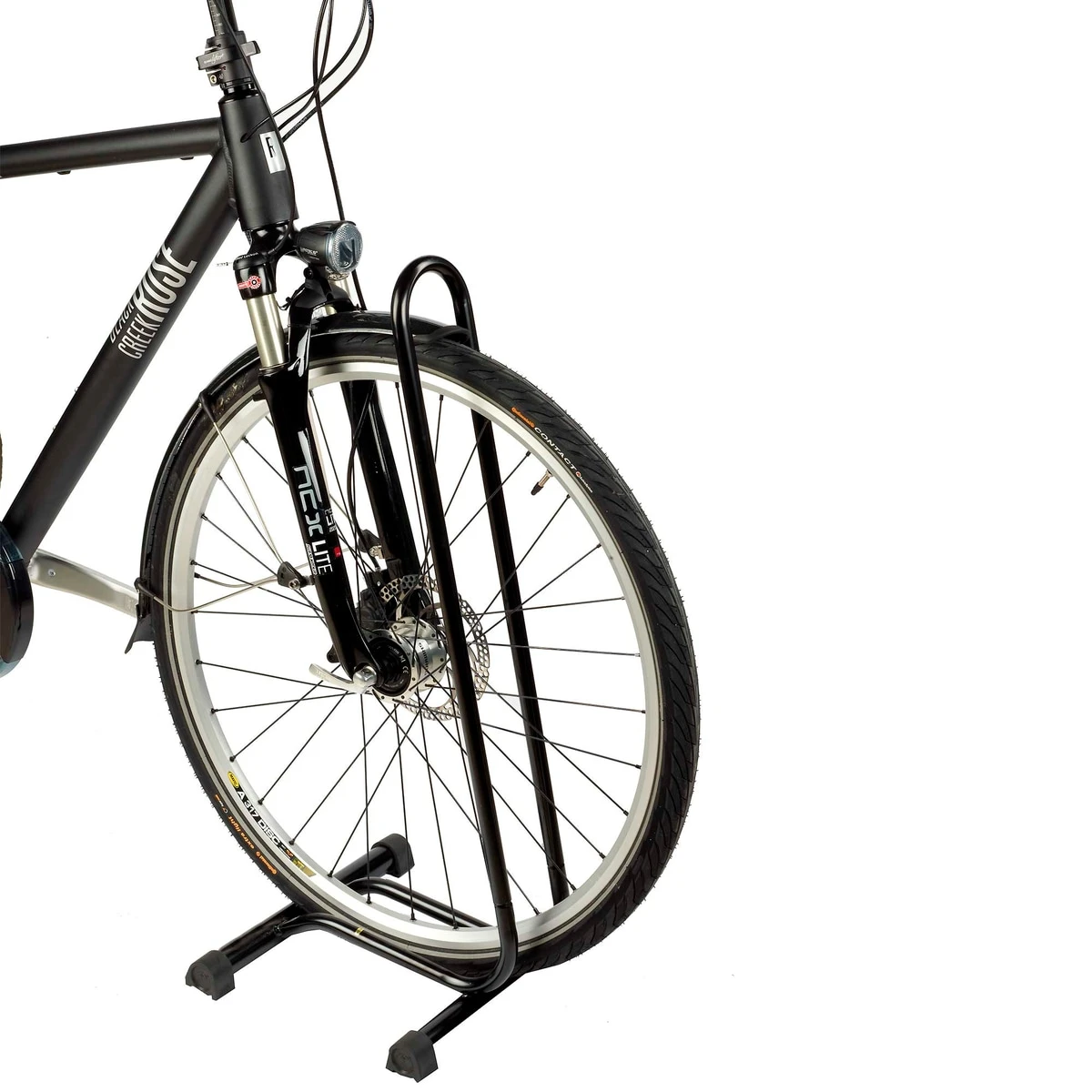 High bike stand you can simply roll your bike into. You can either place front or rear wheel into it. The upper part can be detached via push values, allowing the stand to be dismantled in no time for easy transport.