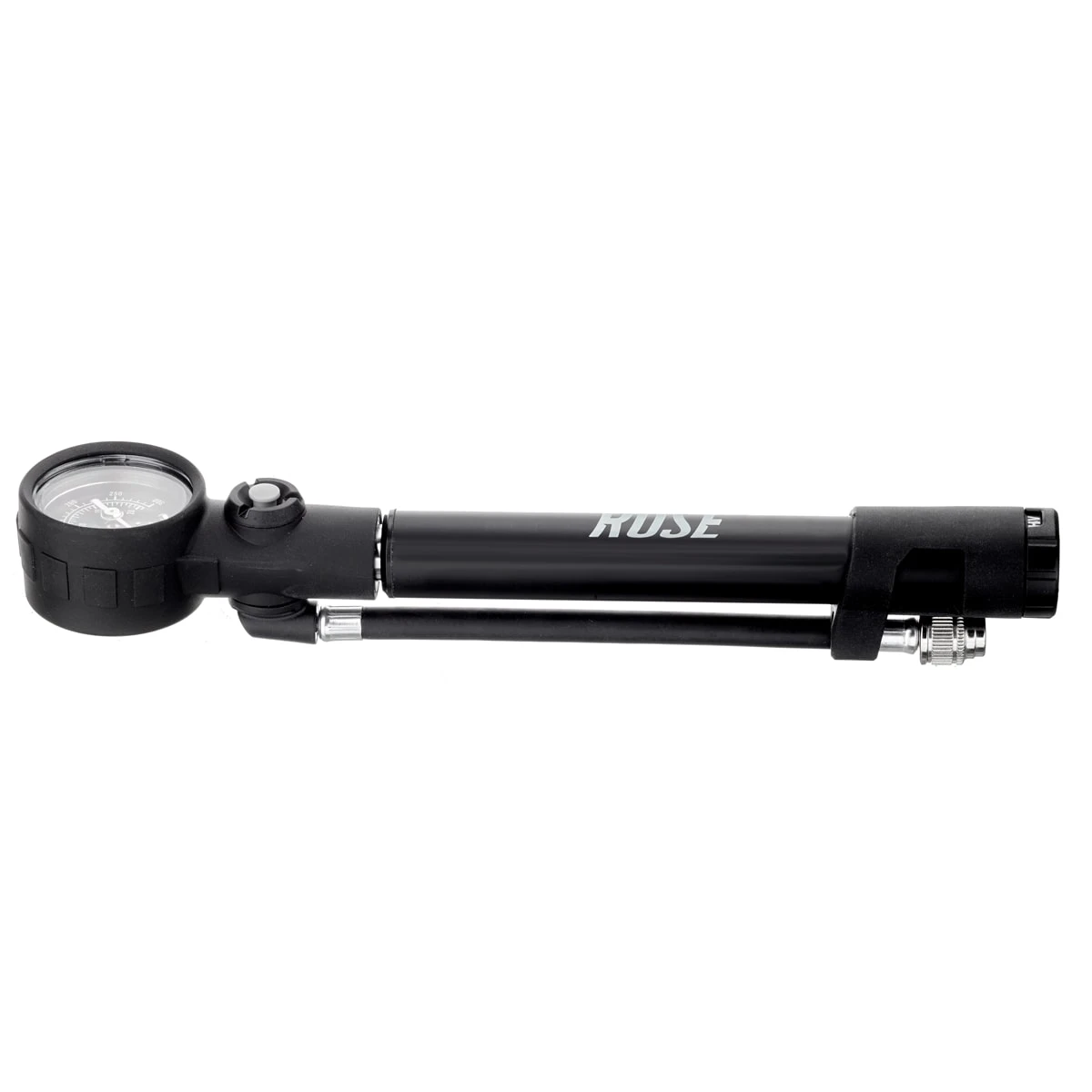 Small, black, stylish… – Providing two different pressure modes, the Shock Blow HP by ROSE is not only good at filling rear shocks and suspension forks, but it can also be used for tyre inflation. For a compact design, the barrel of the shock/suspension fork pump itself serves as a handle. This not only allows for a pocket-size format, but also ensures comfortable handling. In addition, the large contact surface makes for ergonomic handling while the rubber coating on pressure gauge and hose gives you good grip even with increased pumping resistance. You can also easily switch between the high-pressure (HP) and high-volume (HV) setting by simply twisting the pump’s base. This allows you to inflate both suspension elements and large-volume mountain bike tyres with the perfect pressure by using the ROSE Shock Blow.