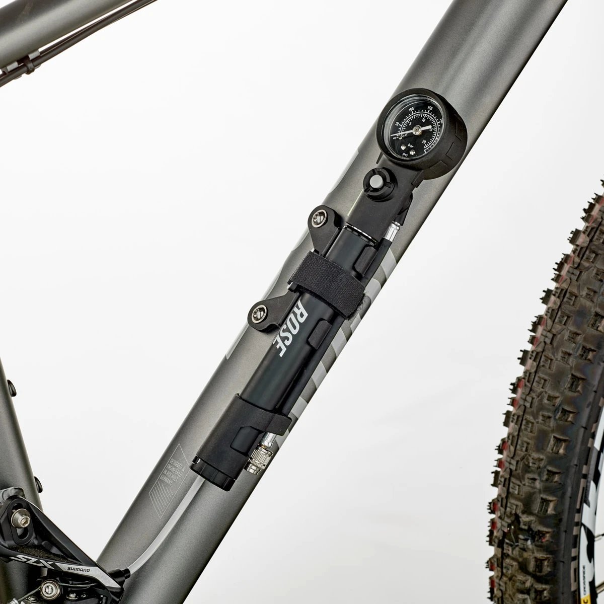 The rotatable pump hose is originally designed for Schrader valves, yet it can also be secured on Presta valves using the included adapter. In the high-pressure setting, less air is inflated per stroke which makes it noticeably easier to pump and inflate the correct pressure. The gauge gives you precise pressure measurements and allows you to regulate pressure via a pressure release value, so you can perfectly adjust it to rider weight and terrain. While cycling, the ROSE pump can be stored inside a bag, a backpack or on the bike frame. Ideally, you can bolt the pump bracket on the bottle cage mounts of your bike. An additional Velcro strap keeps the Shock Blow HP securely in place on rough rides.