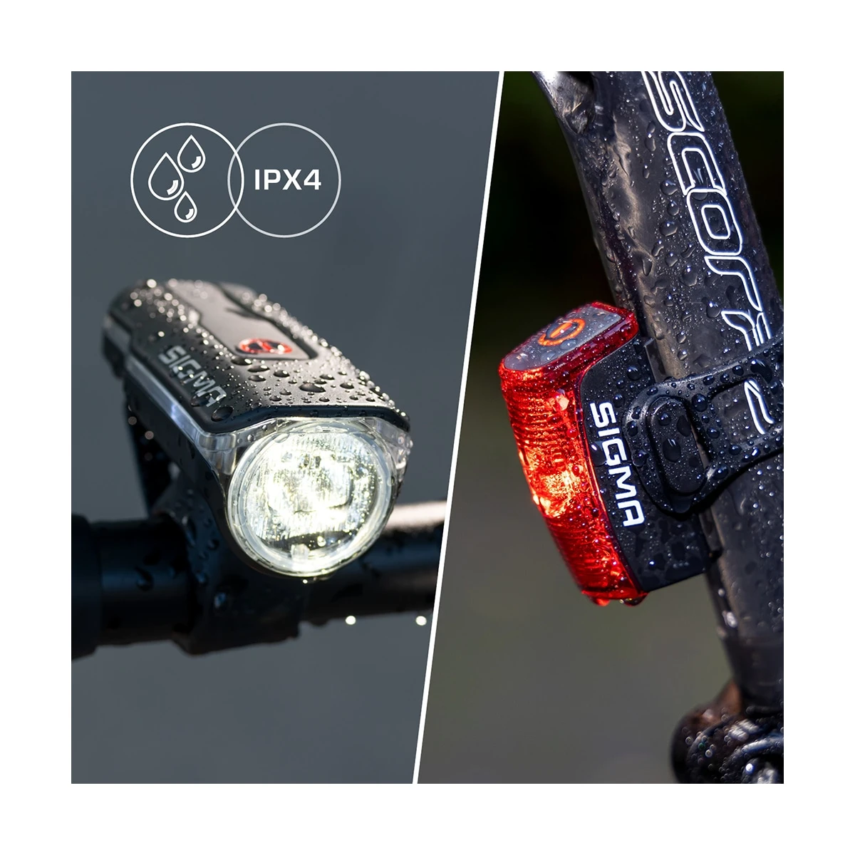 This bike light set consists of Sigma Sport’s front light Aura 60 and rear light Infinity – trusty companions for anyone looking for a high-end bike light set. Both rechargeable lights are easy to mount on the handlebar or seatpost. The headlight offers a strong 60 lux through LED technology and a beam range of up to 70 metres for excellent lighting of paths and streets. It is especially well-suited for athletic riding, as well as commuters.