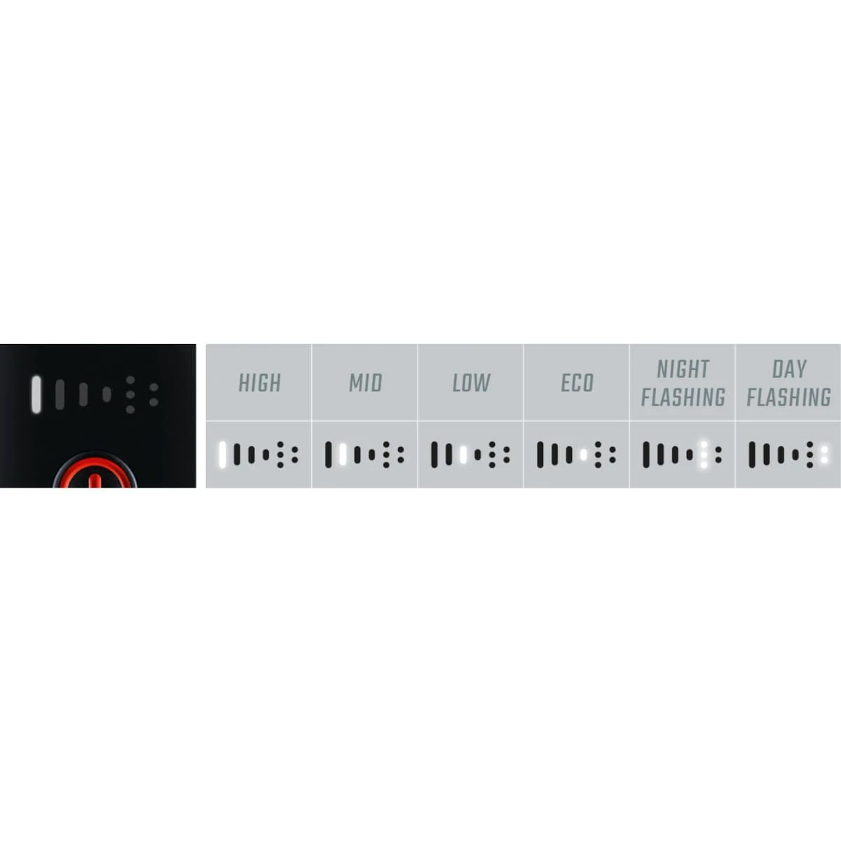 • Light modes: High (1600 lm), Mid (1100 lm), Low (500 Lm), Eco (150 lm), Night Flashing (800/400 lm), Day Flashing (200 lm)