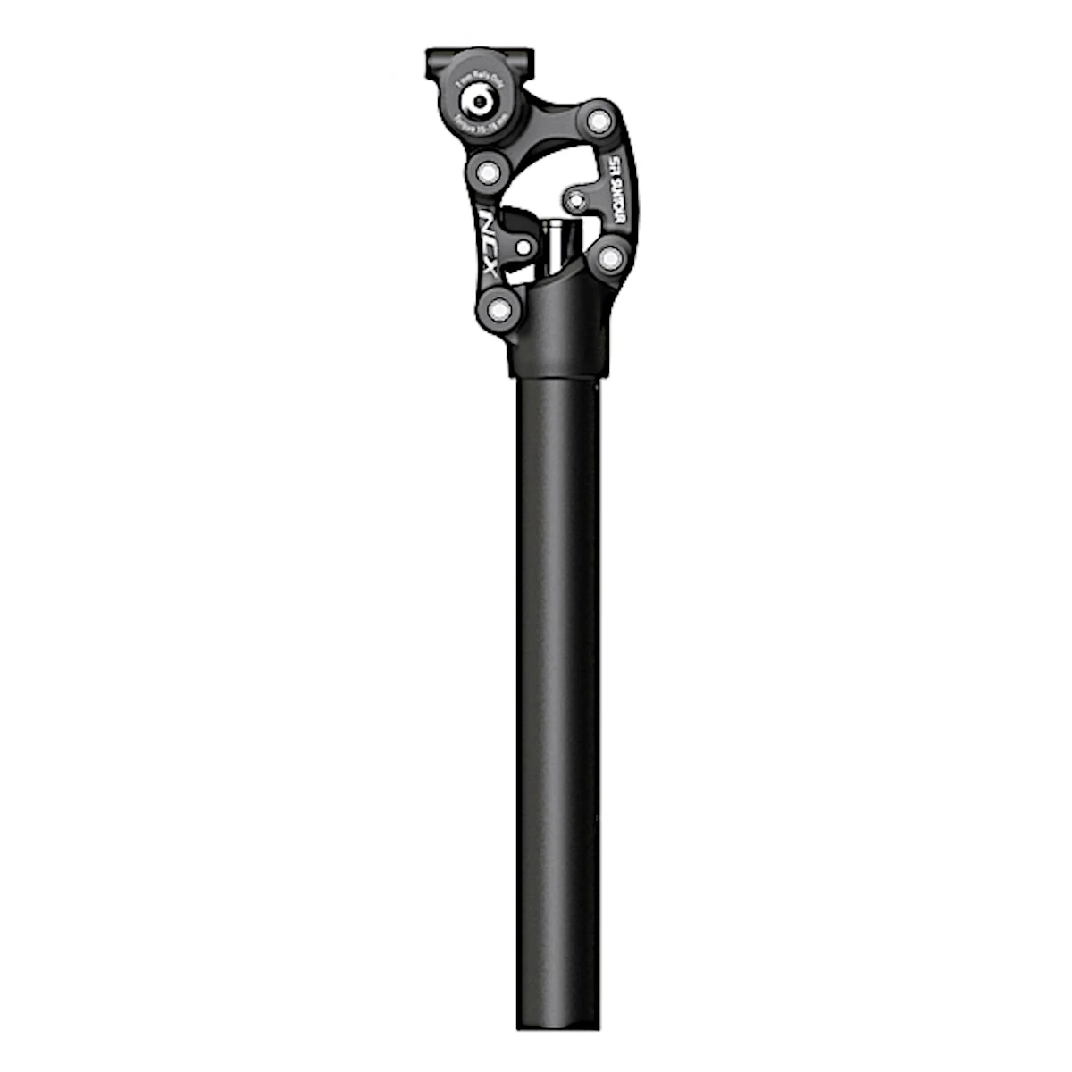 The SR Suntour parallelogram suspension seat posts in the NCX series were developed to dampen vibrations and shocks directly under the saddle. Thanks to the proven parallelogram design, the seat post reacts sensitively to uneven ground and compensates for impacts at a flat angle to the rear and downwards. This movement is generally perceived as much more comfortable and ergonomic than the simple up and down of seat posts without parallelogram technology.