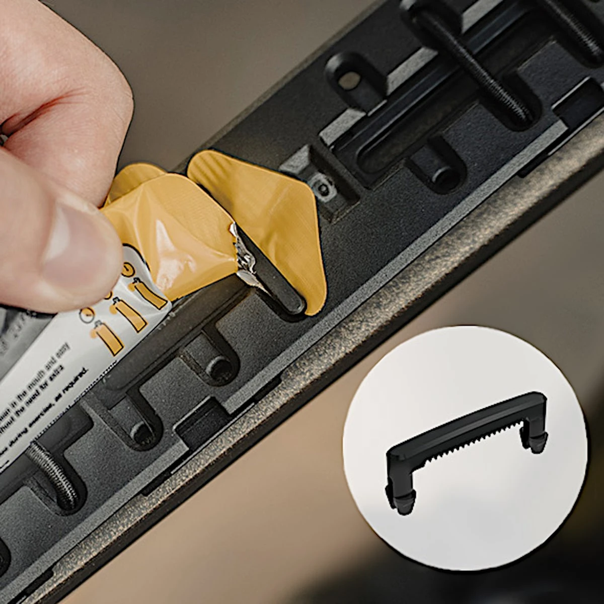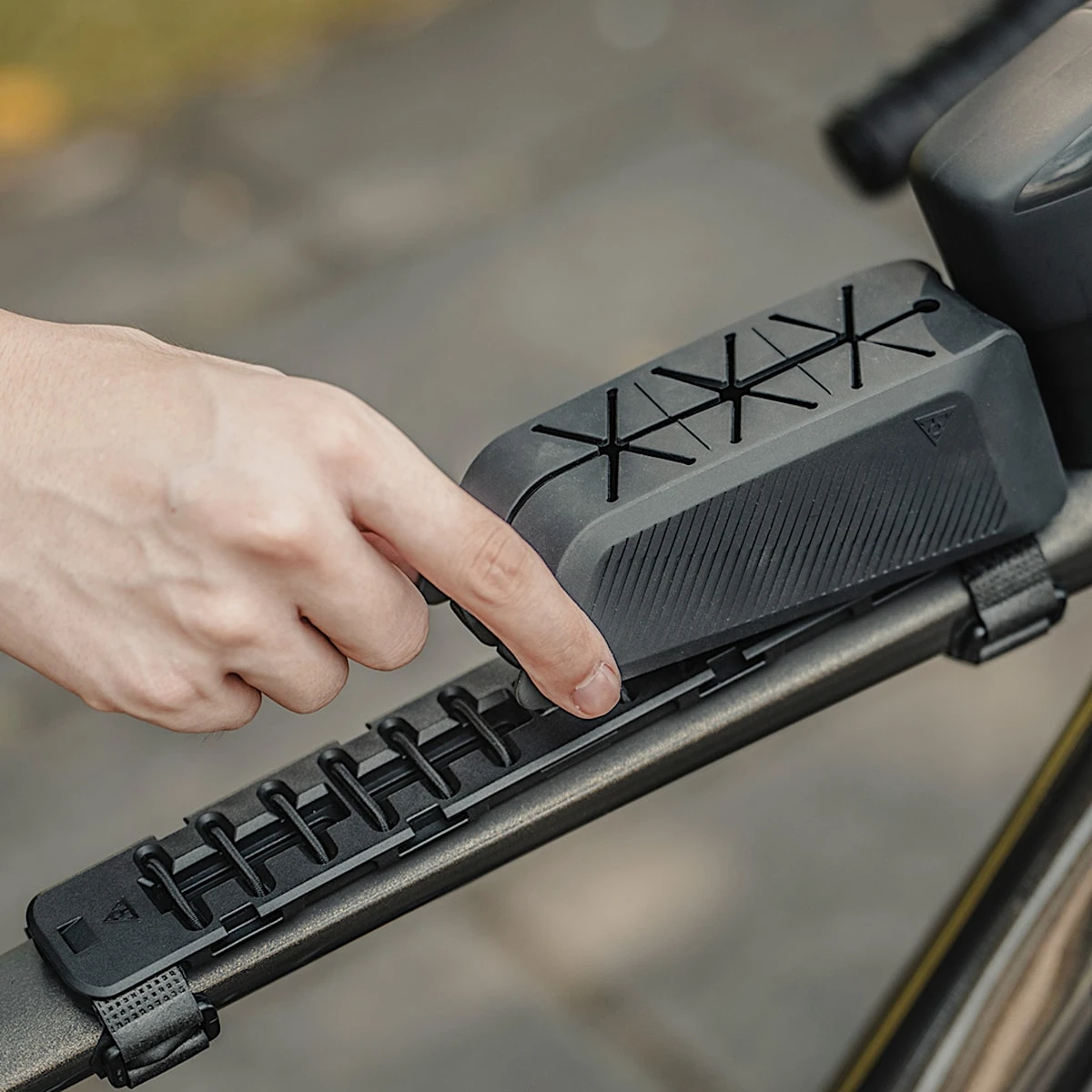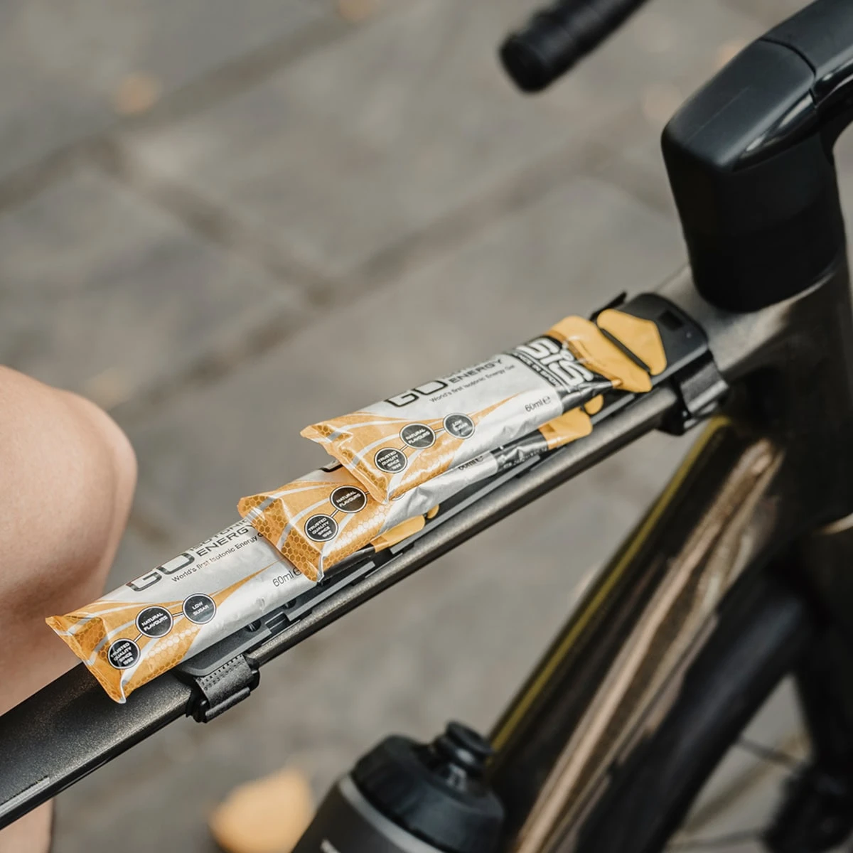 The cutter clips are particularly clever, allowing you to clip gel packs and tear them open with one hand directly on the holder. This keeps you focussed on cycling without distractions. The functional holding system from Topeak can be attached directly to existing top tube screw mounts or with the adjustable straps.